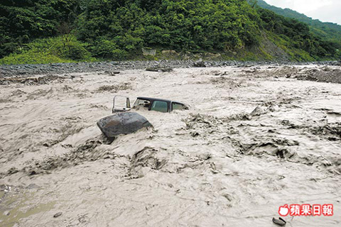 臺(tái)東嘉蘭村一輛吉普車原本要去幫忙拖陷在水中的車子,結(jié)果不慎反而被大水沖走,還好車上的人及時(shí)跳車,并無(wú)人員傷亡。圖片來源:臺(tái)灣《蘋果日?qǐng)?bào)》