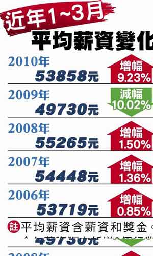 此外,臺當(dāng)局“主計處”昨公布1到3月受雇員工薪資調(diào)查,發(fā)現(xiàn)今年第一季平均薪資有5萬3858元,比去年同期增加4128元,漲幅9.23%是18年來最高,但因金融海嘯期間減薪太多,薪資未回到前年的水平。