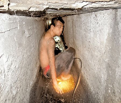 救援的警消無(wú)法鉆入,只能將頭伸入水溝內(nèi)對(duì)他喊話。圖片來(lái)源:臺(tái)灣《中國(guó)時(shí)報(bào)》