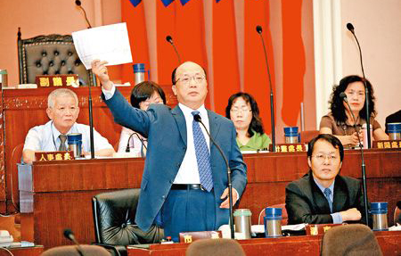 臺(tái)中市日前發(fā)生槍擊案竟有員警在場(chǎng),市長(zhǎng)胡志強(qiáng)“消息不靈”,昨日在議會(huì)現(xiàn)場(chǎng)高舉報(bào)告說“我今天才拿到。”圖片來源:臺(tái)灣《中國(guó)時(shí)報(bào)》