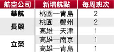 臺當局“民航局”昨公布島內(nèi)航空公司新增航班分配結(jié)果,華航和長榮集團各取得15班,復(fù)興航空分得6班。新航線包括:華航的桃園飛青島、長榮的桃園飛鄭州和高雄飛天津,立榮的高雄飛南京和青島,新增航線每周共飛7班。