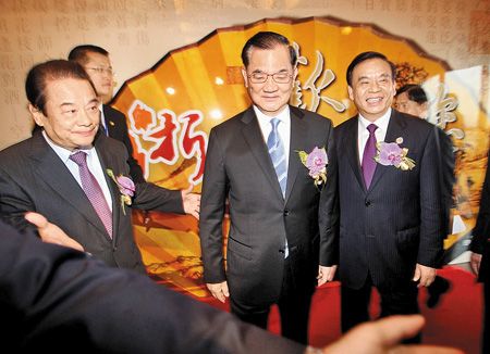 國民黨榮譽主席連戰(zhàn)(中)與浙江省長呂祖善(右)、在臺灣工業(yè)總會理事長陳武雄(左)的陪同下進入論壇會場。圖片來源:臺灣《中國時報》