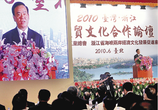 “2010臺灣·浙江經(jīng)貿(mào)文化合作論壇”,浙江省長呂祖善致詞表示,將加強浙江與臺灣多元化合作。圖片來源:臺灣《旺報》