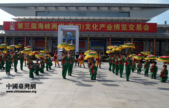 文藝團體在會場前表演節(jié)目慶祝第三屆海峽兩岸文博會開幕。(中國臺灣網(wǎng) 高斯斯 攝)