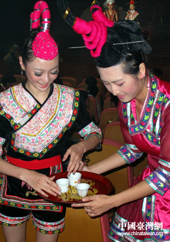 畬族姑娘為臺灣同胞斟酒,歡迎他們的到來。(中國臺灣網(wǎng) 張碩 攝)