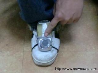 臺(tái)灣一男子在鞋面黏上有攝影功能的手機(jī),鎖定穿短裙的女子進(jìn)行偷拍裙下風(fēng)光情事。圖片來源:臺(tái)灣今日新聞網(wǎng)
