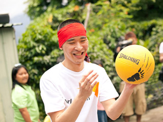 黃立行不畏高溫,前往“八八風(fēng)災(zāi)”災(zāi)區(qū)協(xié)助災(zāi)民,還跟小孩玩起躲避球。圖片來(lái)源:臺(tái)灣世界展望會(huì)