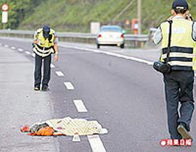 臺灣昨天清晨,在某高速公路段一男子遭車禍,橫尸路面頭顱爆碎。圖片來源:臺灣《蘋果日報(bào)》