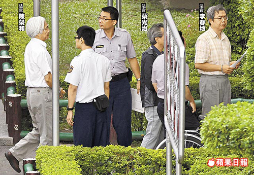 收賄讓資深法官淪為階下囚,法官李春地、蔡光治、陳榮和昨戴著手銬被押解進(jìn)入臺北看守所。圖片來源:臺灣《蘋果日報》