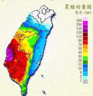 除新營降雨量達超大豪雨標準外,臺南縣北門鄉(xiāng)、嘉義縣義竹鄉(xiāng)東后寮降雨量為250.5毫米、240毫米,也已超過大豪雨標準(即24小時累積雨量200毫米以上)。此外,臺南縣下營鄉(xiāng)及嘉義縣樸子鄉(xiāng)降雨也逼近豪雨標準。