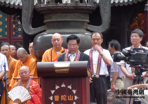 臺灣南海觀音文教基金理事長吳天池代表臺灣信眾致賀詞(圖片來源:舟山市臺辦)