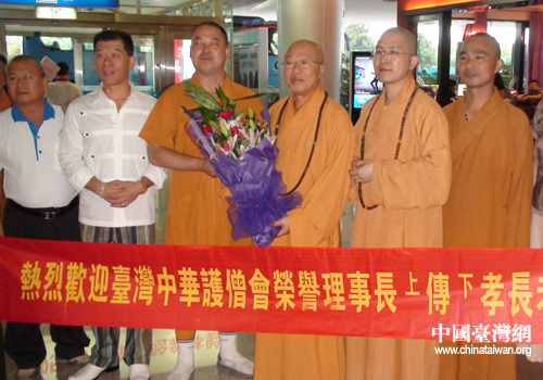在機場迎接臺灣中華護僧協(xié)會名譽理事長傳孝長老一行(圖片來源:舟山市臺辦)