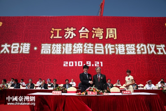 中國(guó)臺(tái)灣網(wǎng)9月21日太倉消息 9月21日,江蘇太倉港與高雄港締結(jié)合作港簽約儀式在太倉港集裝箱碼頭舉行。標(biāo)志著太倉港與臺(tái)灣經(jīng)濟(jì)領(lǐng)域的合作進(jìn)一步加強(qiáng)。(記者 鐘寶華)