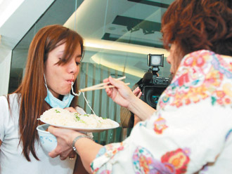 莎莎(左)22日返臺(tái),母親趕緊送上豬腳面線壓驚。 來(lái)源:臺(tái)灣《聯(lián)合報(bào)》