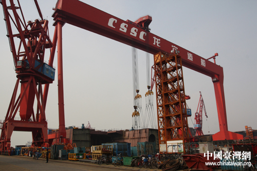 龍穴造船基地的龍門吊,承重力達600噸,并可實現(xiàn)多臺自由拼裝組合(中國臺灣網(wǎng) 趙輝 攝)