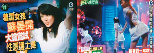 9月12日,臺(tái)灣女藝人蘇晏霈及2名舞者在綜藝節(jié)目《新兵進(jìn)行曲》里大跳護(hù)士舞,節(jié)目還沒播完,臺(tái)灣護(hù)理師護(hù)士公會(huì)全聯(lián)會(huì)理事長盧美秀就接獲不少護(hù)士抗議電話。呂月榮打開電視一看,只見藝人披頭散發(fā)戴著護(hù)士帽,身著超短護(hù)士服、黑色長靴熱舞,在熒光幕前扭腰擺臀,極盡賣弄“白色性感”。