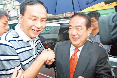國民黨新北市長參選人朱立倫(左)出席親民黨新北市議員參選人李肇南競選總部成立大會,特地等到親民黨主席宋楚瑜(右)到場并與他握手致意后才離開。 來源:臺灣《中國時報》