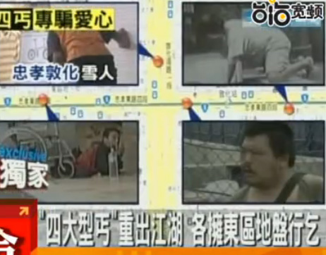 中國(guó)臺(tái)灣網(wǎng)10月21日消息 據(jù)臺(tái)灣中天電視臺(tái)報(bào)道,一直被臺(tái)媒及臺(tái)灣網(wǎng)友熱炒的臺(tái)北東區(qū)“四大型丐”近日再現(xiàn)江湖,綽號(hào)為“雪人”、“搖頭”、“達(dá)摩”、“皇帝”的4名“乞丐”在臺(tái)北東區(qū)形成4大“丐王”的局面,他們各自擁有固守地盤,各有標(biāo)志性的裝束及“病因”,假裝身有殘疾乞討。雖然4人已被列為警方特別管制對(duì)象,當(dāng)仍然阻擋不了他們行乞,阻擋不了“皇帝”“乞丐”月收入近10萬(wàn)(新臺(tái)幣,下同)的可觀收入。