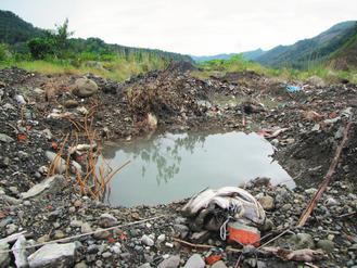 高雄縣甲仙鄉(xiāng)小林村遺址,疑似遭歹徒以機(jī)具開(kāi)挖,罹難村民的鞋子等遺物,橫陳在積水的坑洞旁。圖片來(lái)源:臺(tái)灣《聯(lián)合報(bào)》