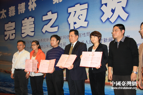 歡送儀式上,為第六屆中國網(wǎng)絡(luò)媒體山東行采訪活動的支持與合作單位山東亞太森博漿紙有限公司、中國重汽、完美(中國)日用品有限公司、圣元營養(yǎng)食品有限公司頒發(fā)榮譽(yù)證書。(中國臺灣網(wǎng) 劉海偉 攝)