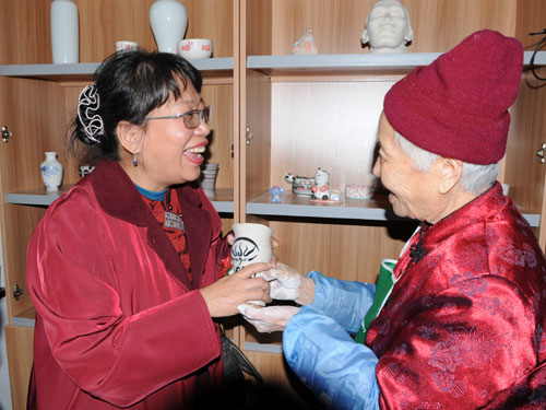 83歲的老人彭朝珍還將親手制作的四川臉譜圖案筆筒送給陳芳姿。圖片來(lái)源:四川省臺(tái)辦