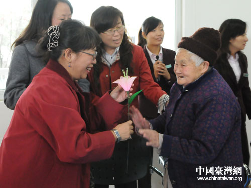 都江堰市綜合社會(huì)福利院老人將親手制作的花送給陳芳芝。圖片來(lái)源:四川省臺(tái)辦