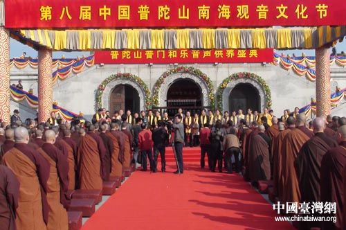 中國(guó)臺(tái)灣網(wǎng)11月5日舟山消息 今天上午,第八屆中國(guó)南海觀音文化節(jié)在浙江普陀山南海觀音大佛廣場(chǎng)隆重開幕。臺(tái)灣南鯤鯓代天府和臺(tái)灣靈鷲山等佛教交流團(tuán)共200余人應(yīng)邀參加文化節(jié)。