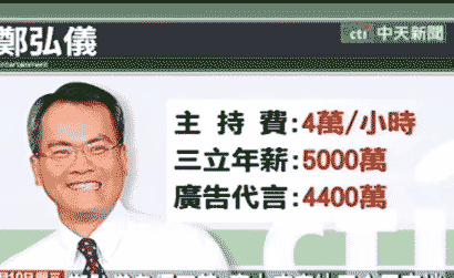 據(jù)報(bào)道,作為臺(tái)灣三立電視臺(tái)的招牌主持人,鄭弘儀的收入頗豐。他在臺(tái)灣三立電視臺(tái)的純年薪為5000萬(wàn)元,主持節(jié)目另算,每小時(shí)為4萬(wàn)元。加上每年4000萬(wàn)的廣告費(fèi),鄭弘儀的收入逼近億元大關(guān)。