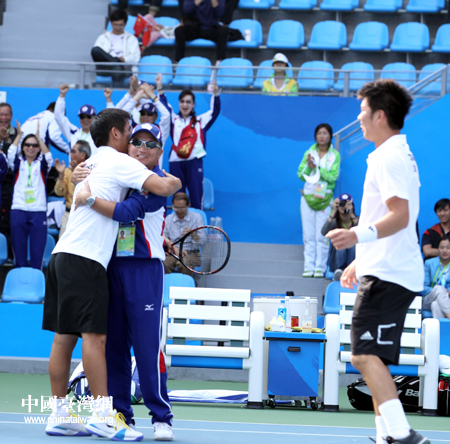 中華臺北男團(tuán)同教練擁抱慶祝勝利。(中國臺灣網(wǎng) 鐘寶華 攝)