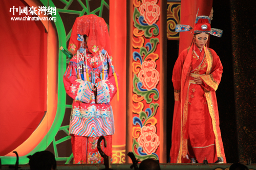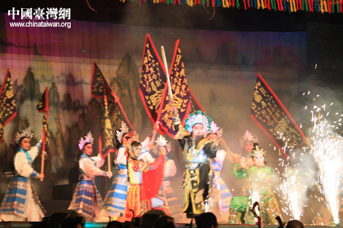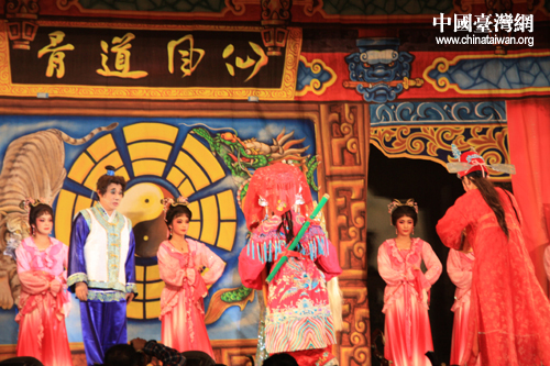 臺(tái)灣明華園黃字劇團(tuán)與漳州市薌劇團(tuán)同臺(tái)獻(xiàn)演大型歌仔戲《周公法斗桃花女》。(中國臺(tái)灣網(wǎng) 胡珊珊 攝影)