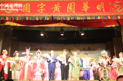 臺(tái)灣明華園黃字劇團(tuán)與漳州市薌劇團(tuán)同臺(tái)獻(xiàn)演大型歌仔戲《周公法斗桃花女》,圖為劇團(tuán)團(tuán)長及主要演員謝幕。(中國臺(tái)灣網(wǎng) 胡珊珊 攝影)