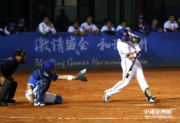 亞運(yùn)棒球決賽,中華臺(tái)北隊(duì)3:9不敵韓國(guó)隊(duì)獲得亞軍。圖為中華臺(tái)北隊(duì)隊(duì)員擊球。(中國(guó)臺(tái)灣網(wǎng) 鐘寶華 攝)