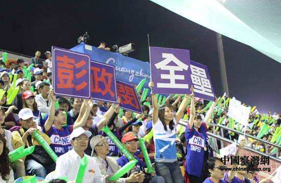 比賽打響后,能容納4200人的廣東奧體中心棒球場已然座無虛席。隨著雙方場上的爭奪逐漸激烈,場下啦啦隊間的比拼熱度也隨之走高。臺灣球迷棒球比賽別具一格助威的口號一直為人稱道:“伸出你的左手,安打安打!伸出你的右手,全壘打全壘打!” 而當韓國隊員投球時,中華臺北隊的球迷就開始大喊“麻吉麻吉,三振出局!”而伴隨中華臺北隊在2006年多哈亞運會上奪冠的閩南歌曲《燒肉粽》也是一次又一次在場上響起。