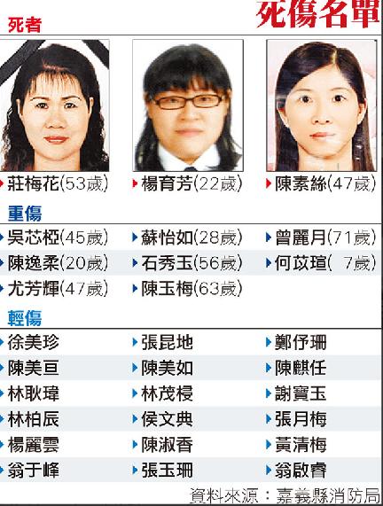 目擊車禍的志工形容,當(dāng)時(shí)車內(nèi)乘客就像疊羅漢般擠在一起,有被拋飛的、哀號(hào)聲四起,還好不少是受過緊急救護(hù)訓(xùn)練的志工,忍著疼痛投入救護(hù),救難人員架梯破車窗把傷者抬出車外,但陳素絲(47歲)、莊梅花(53歲)及楊育芳(22歲)3人送醫(yī)時(shí),已無生命跡象。石秀玉傷心地說:“前一夜姐妹們練土風(fēng)舞練到很晚,原打算上山時(shí)表演帶給大家歡樂,沒想到如今卻是死的死、傷的傷!