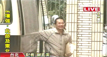 陳水扁拿著裝有卷宗的黃色牛皮紙裝,向在場媒體揮手致意后在戒護(hù)人員陪同下快速步入法院。