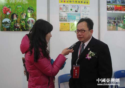 率隊參加展銷會的臺灣海峽農(nóng)業(yè)基金會董事長黃一鐘接受媒體采訪(荊州市臺辦通訊員 張青松 攝)