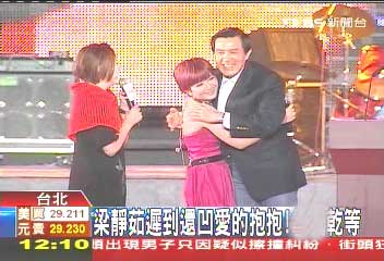 中國臺(tái)灣網(wǎng)1月5日消息 據(jù)臺(tái)灣TVBS電視臺(tái)報(bào)道,去年圣誕夜,歌手梁靜茹讓馬英九在后臺(tái)干等近半小時(shí)!而且上臺(tái)后,還要求趕時(shí)間的馬英九,給她愛的抱抱。下臺(tái)后梁靜茹還要求合照,由于馬英九要趕下一場活動(dòng),這讓馬英九的維安人員急到跳腳。