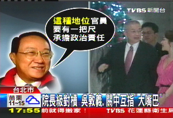 其實兩位“院長級”官員互杠,早就不是第一次了。最近結(jié)下的梁子是“行政院”鬧出“二代健保”轉(zhuǎn)述爭議,吵得風(fēng)風(fēng)雨雨,恰好“考試院”提出大嘴巴條款,規(guī)范政務(wù)官要為嚴(yán)重失言下臺,關(guān)中立刻挺身暗指吳敦義做到這種地位,要有一把尺,承擔(dān)政治責(zé)任。(中國臺灣網(wǎng) 吳斌)
