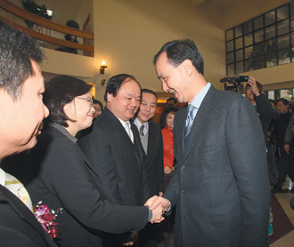 中國(guó)臺(tái)灣網(wǎng)1月18日消息 據(jù)臺(tái)灣《聯(lián)合報(bào)》報(bào)道,新北市議會(huì)民進(jìn)黨團(tuán)今(18)日上午舉辦干部交接儀式,民進(jìn)黨黨主席蔡英文前往參加,并主持印信監(jiān)交;新北市長(zhǎng)朱立倫也率市府官員到場(chǎng)觀禮。兩位新北市長(zhǎng)選舉對(duì)手選后首次“碰面”,雙方都展現(xiàn)風(fēng)度,三度握手向?qū)Ψ街乱狻?/P>