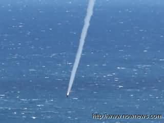 臺軍導彈從發(fā)射箱射出后由于燃燒不完全,直接墜落海面。圖片來源:臺灣“今日新聞網(wǎng)”