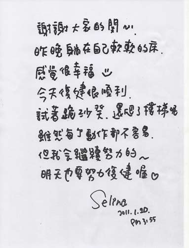 Selina遭燒傷近3個月,不僅對她本身是一個大考驗(yàn),對家人和未婚夫來說也是個煎熬,所幸這一切都已過去,Selina挺過困難終于出院。據(jù)報道,Selina回到家安頓后,特地寫信謝謝大家關(guān)心,Selina在信上說道:謝謝大家的關(guān)心,昨晚躺在自己軟軟的床,感覺很幸福。此外她還透露復(fù)健狀況,表示復(fù)健很順利,試著跪在沙發(fā)上,還爬了樓梯,雖然每個動作還不容易,但會繼續(xù)努力。信的最后還畫上了一個笑臉。(中國臺灣網(wǎng) 吳斌)