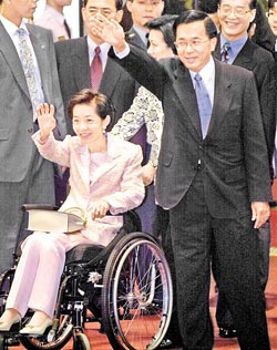 告別錦衣玉食。陳水扁妻子吳淑珍出席重要場合非常鐘情這襲粉紅長褲套裝,前幾天還向親近友人說:“哪一天我‘回家’了,一定要讓我再穿一次……”圖片來源:臺灣《中國時報》