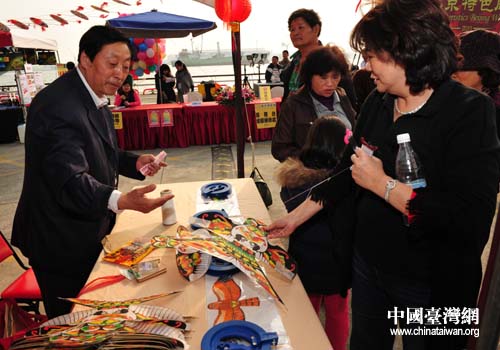 臺灣民眾對北京風箏充滿興趣,現(xiàn)場向老師請教技巧(圖片來源:北京市臺辦)