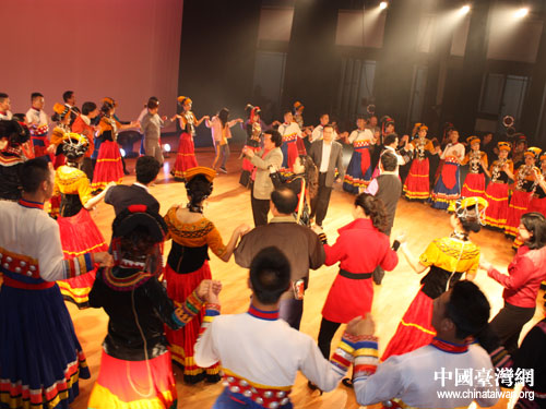 演出結(jié)束臺灣民眾與演員們共同跳起歡快的《達(dá)體舞》。圖片來源:四川省臺辦