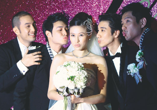 唐志中(左)與張庭緁(中)昨天結(jié)婚,好友陳建州(右)、王力宏(右二)、潘瑋柏(左二)當(dāng)伴郎。圖片來源:臺灣《聯(lián)合報》