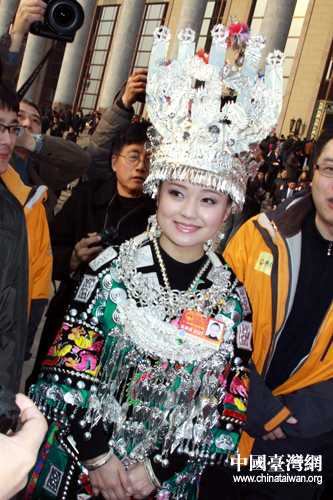 來自貴州省黔東南苗族侗族自治洲,被譽(yù)為苗家百靈的“80后”全國人大代表阿幼朵。(中國臺(tái)灣網(wǎng) 董潔 攝)