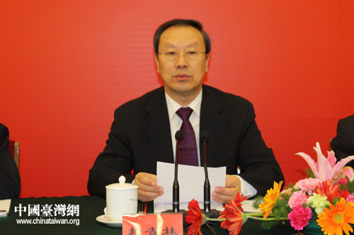 全國(guó)政協(xié)副主席、中共中央統(tǒng)戰(zhàn)部部長(zhǎng)、中國(guó)和平統(tǒng)一促進(jìn)會(huì)執(zhí)行副會(huì)長(zhǎng)杜青林出席會(huì)議并講話。(中國(guó)臺(tái)灣網(wǎng) 趙輝 攝)