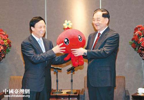 中共陜西省委常委、西安市委書(shū)記孫清云向國(guó)民黨榮譽(yù)主席連戰(zhàn)贈(zèng)送西安世園會(huì)吉祥物(陜西省臺(tái)辦通訊員 霍炳男 攝)