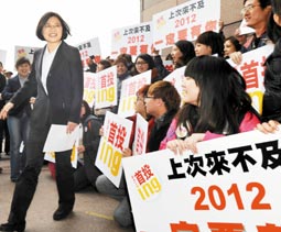 蘇貞昌前腳剛離開(kāi)民進(jìn)黨中央黨部,蔡英文陣營(yíng)馬上號(hào)召“首投族”會(huì)師喊口號(hào)。蔡英文表示,“首投族”一種是第一次投票的年輕人,一種是明年第一次投票給蔡英文的人。