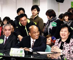 蘇貞昌(前排中)在12位“跨世代”好友陪同下,登記民進(jìn)黨內(nèi)臺(tái)灣地區(qū)領(lǐng)導(dǎo)人初選。圖片來(lái)源:臺(tái)灣《聯(lián)合報(bào)》